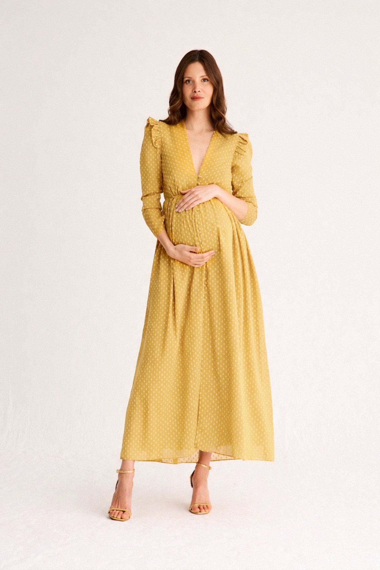 En cuanto al largo, los vestidos midi y largos son una opción muy práctica durante el embarazo. Permiten libertad de movimiento y resultan especialmente favorecedores en looks de invitada para bodas de día o de tarde.