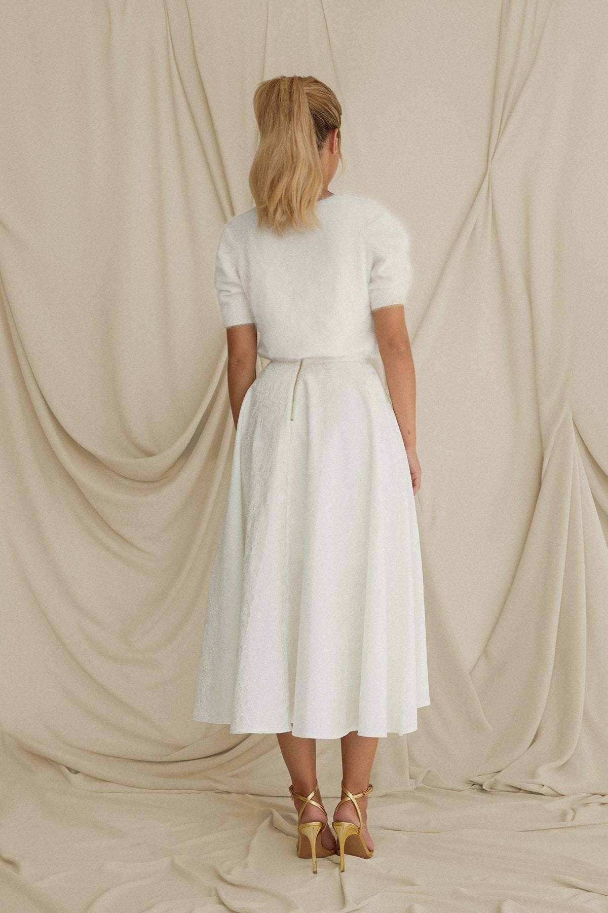 Nuestra falda Rania esta confeccionada en jacquard bordado que le da un toque super elegante y rico en texturas y matices.