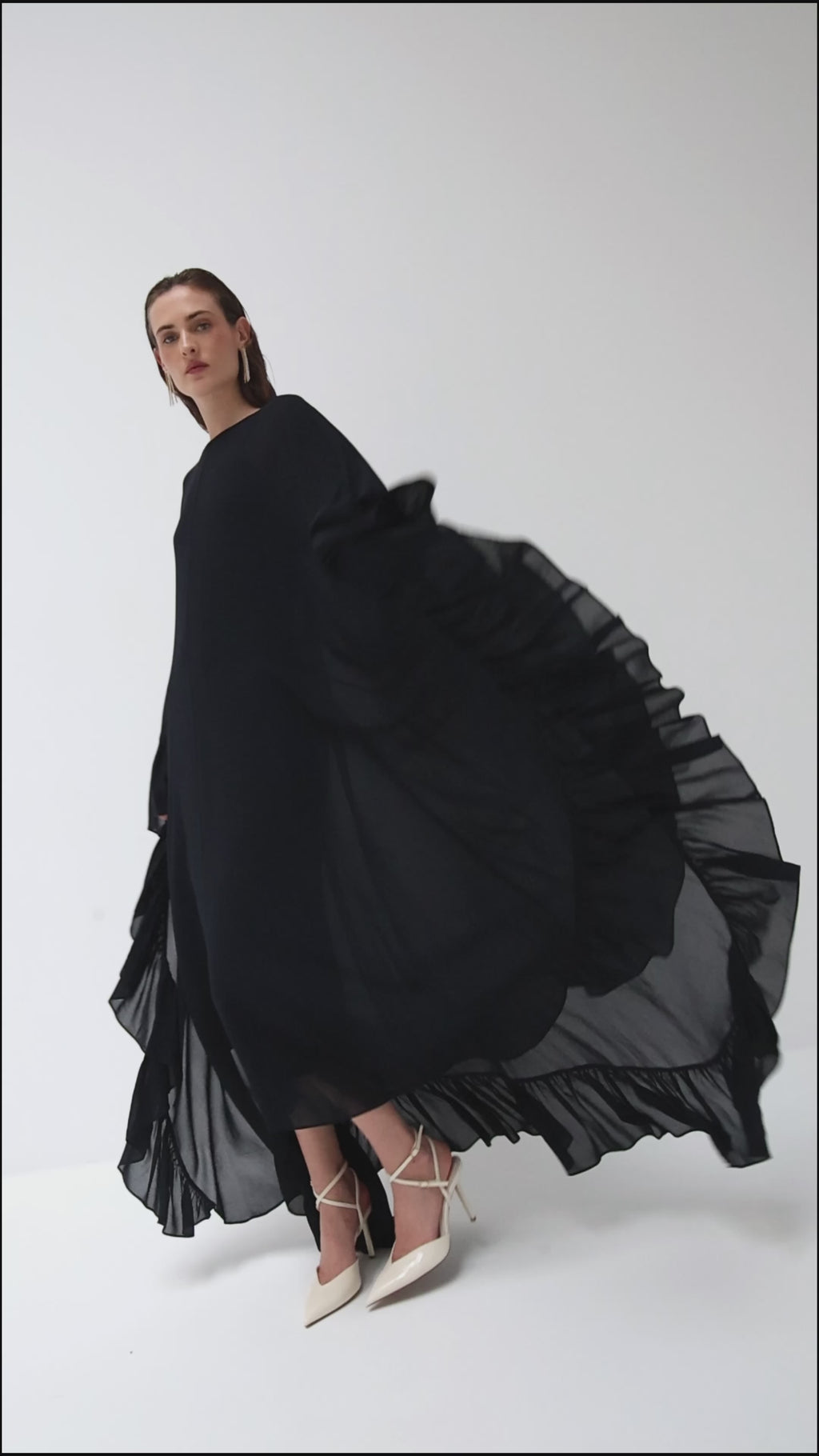 The design combines two pieces that layer harmoniously: an inner slip dress with adjustable straps that comfortably hugs the body, and an outer dress in flowing georgette with bias-cut ruffles that add movement, lightness, and delicacy. The result is a bohemian and contemporary look that balances comfort and sophistication.