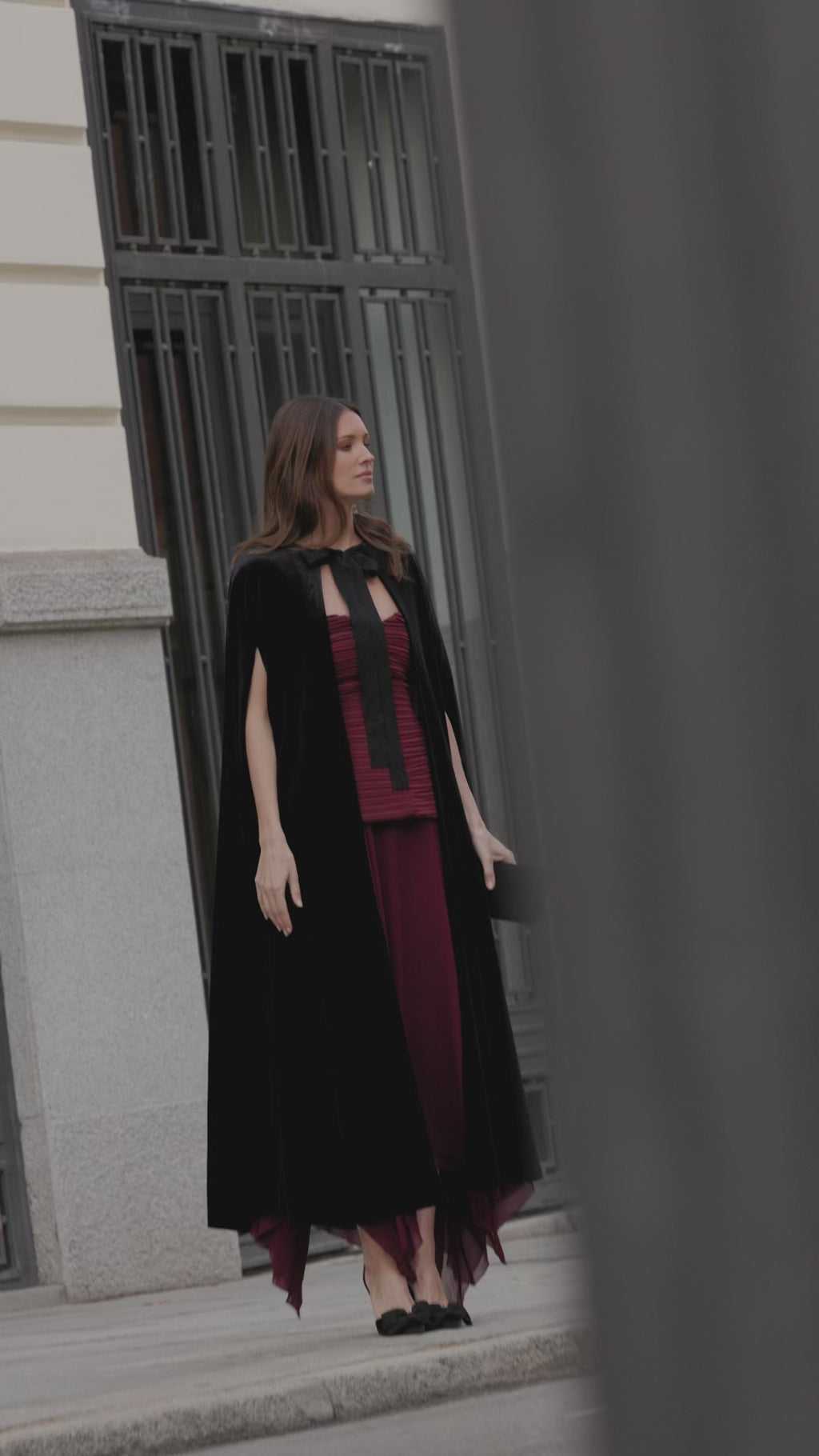El top Wendy en tono burdeos es una de las piezas más especiales de la temporada. Confeccionado en mikado —un tejido estructurado con cuerpo y un sutil brillo—, aporta profundidad, elegancia y carácter a cualquier look.