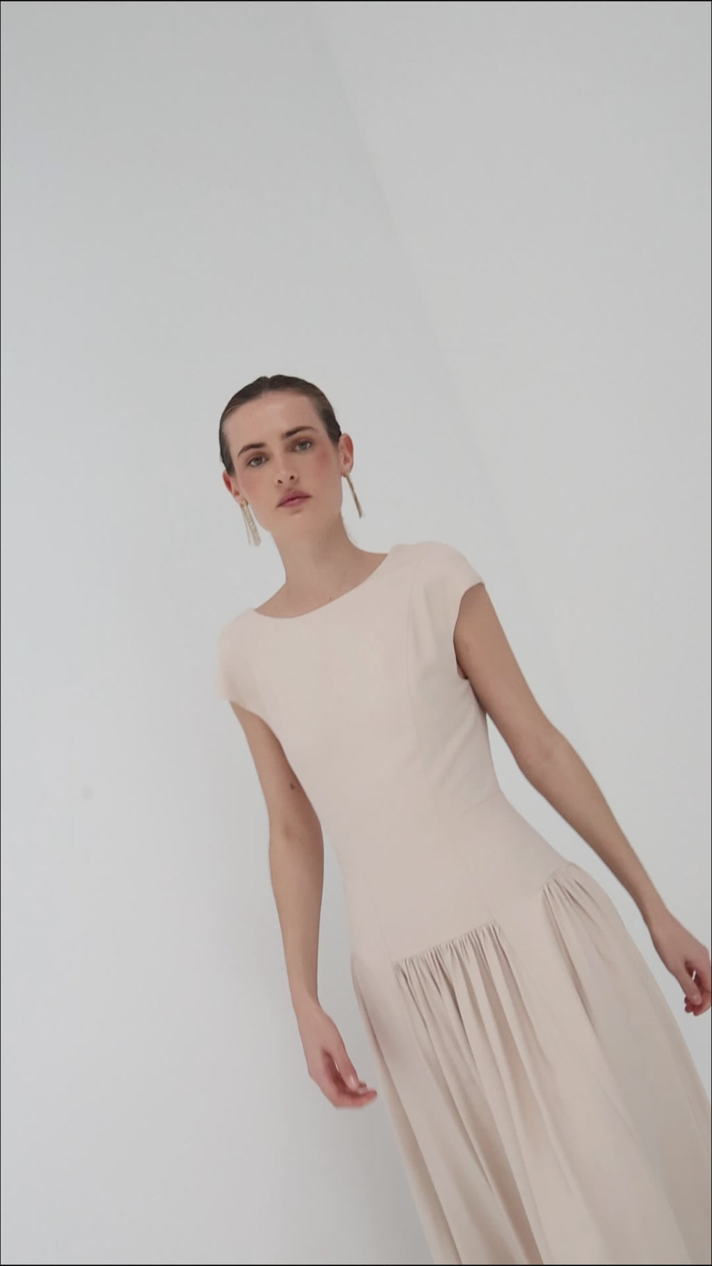 Confectionnée dans un tissu léger au toucher doux et au tombé naturel, sa teinte sable — chaude, enveloppante et sophistiquée — illumine la peau et confère une présence sereine, parfaite pour les célébrations en plein air, les mariages de jour et les événements de printemps-été.